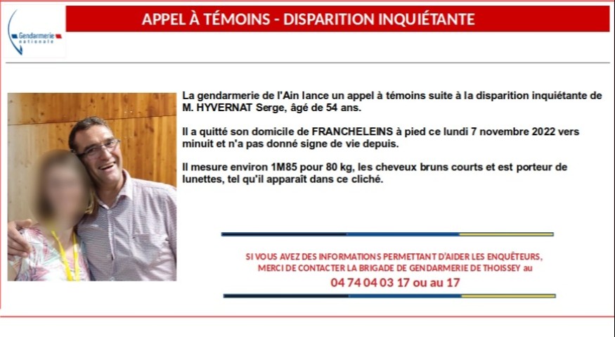 C’est sur cette commune qui a fusionné avec Francheleins qu’un habitant de 54 ans est porté disparu. Il est parti à pied cette nuit un peu après minuit. Les recherches menées avec des drones et des chiens n’ont encore rien donné et l’inquiétude est de mise car ce monsieur est dépressif. Retrouvez l'appel à témoins si vous pouvez aider les gendarmes et les pompiers à le localiser.