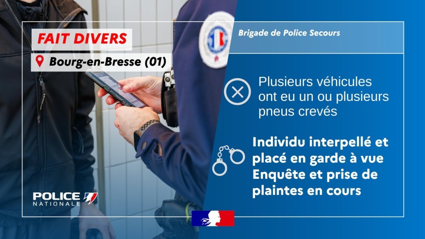 En fait, les forces de l'ordre ont été prévenues vers 02h30 qu'un individu crevait volontairement les pneus de voitures stationnées avec une perceuse à batterie, cours de Verdun à Bourg-en-Bresse.