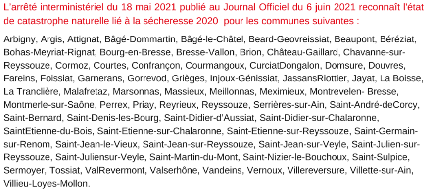 FC Radio - L’arrêté interministériel du 18 mai 2021 publié au Journal Officiel du 6 juin 2021 reconnaît l’état de catastrophe naturelle pour les communes de Arbigny, Argis, Attignat, Bâgé-Dommartin, Bâgé-le-Châtel, Beard-Geovreissiat, Beaupont, Béréziat, Bohas-Meyriat-Rignat, Bourg-en-Bresse, Bresse-Vallon, Brion, Château-Gaillard, Chavanne-sur-Reyssouze, Cormoz, Courtes, Confrançon, Courmangoux, Curciat-Dongalon, Domsure, Douvres, Fareins, Foissiat, Garnerans, Gorrevod, Grièges, Injoux-Génissiat, Jassans-Riottier, Jayat, La Boisse, La Tranclière, Malafretaz, Marsonnas, Massieux, Meillonnas, Meximieux, Montrevelen-Bresse, Montmerle-sur-Saône, Perrex, Priay, Reyrieux, Reyssouze, Serrières-sur-Ain, Saint-André-de-Corcy, Saint-Bernard, Saint-Denis-les-Bourg, Saint-Didier-d’Aussiat, Saint-Didier-sur-Chalaronne, Saint-Etienne-du-Bois, Saint-Etienne-sur-Chalaronne, Saint-Etienne-sur- Reyssouze, Saint-Germain-sur-Renom, Saint-Jean-le-Vieux, Saint-Jean-sur-Reyssouze, Saint-Jean-sur-Veyle, Saint-Julien-sur-Reyssouze, Saint-Juliensur-Veyle, Saint-Martin-du-Mont, Saint-Nizier-le-Bouchoux, Saint-Sulpice, Sermoyer, Tossiat, Val-Revermont, Valserhône, Vandeins, Vernoux, Villereversure, Villette-sur-Ain, Villieu-Loyes-Mollon au titre de la sécheresse survenue en 2020.