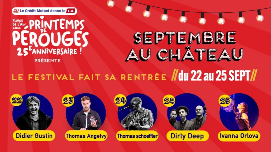 Le château de Chazey-sur-Ain est investi dès ce jeudi 22 septembre à dimanche 25 septembre 2022 pour fêter les 25 ans du festival incontournable de l'Ain. Cette fois l'ambiance sera différente du mois de juin avec Sting, Vianney, Grand Corps Malade ou encore Francis Cabrel au Polo club de Saint-Vulbas. Sous un beau chapiteau de cirque, les artistes qui vont se produire seront tout proche du public.
